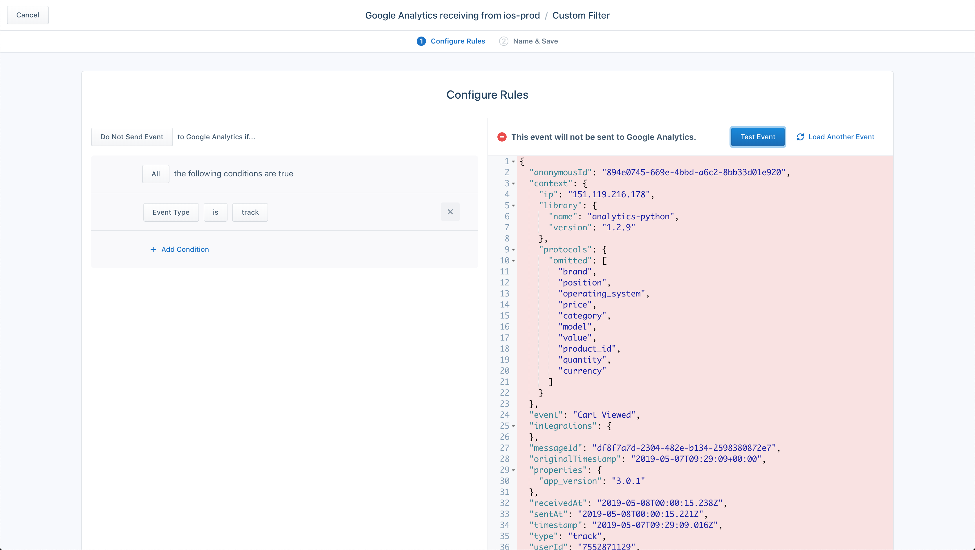 Use the Destination Filter tester during setup to verify that you’re filtering out the right events. Filtered events show up on the schema page but aren’t counted in event deliverability graphs.