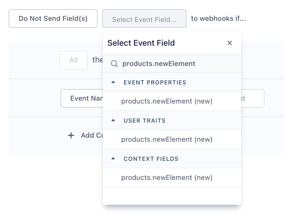 To block the Identify event trait products.newElement, select the option under the User Traits list instead. To block a context object field products.newElement, select it from the Context Fields list.