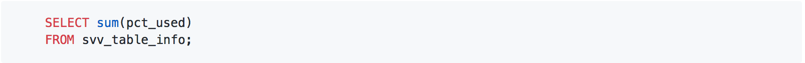 To check if you’re getting close to your max, run this query. It will tell you the percentage of storage used in your cluster. Segment recommends that you don’t exceed 75-80% of your storage capacity. If you approach that limit, consider adding more nodes to your cluster.