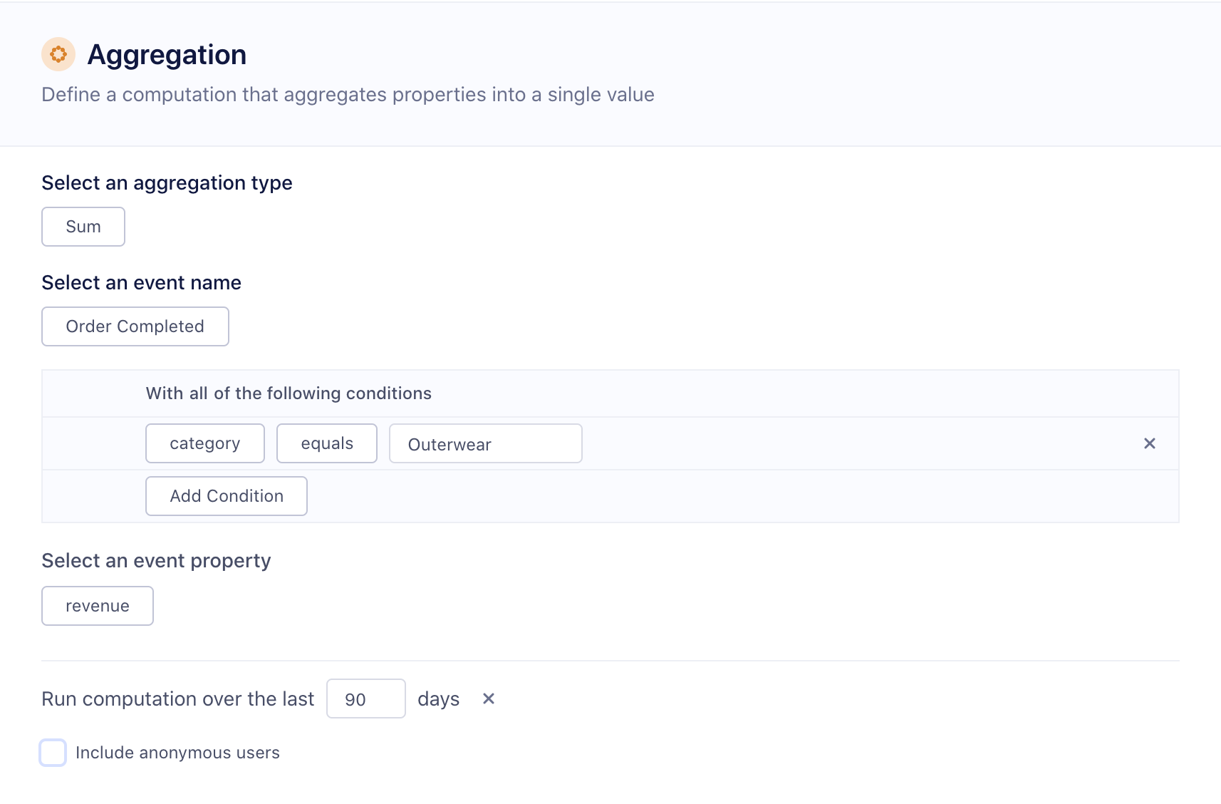 An aggregation computes a sum, average, minimum, or maximum of a numeric event property. A good example is a sum_cosmetics_revenue_90_days if you’re sending an Order Completed event with a revenue property. In the example we’re refining the revenue even further based on another event property: category = 'cosmetics'. Note that you can only compute an aggregation trait for event properties that have a numeric value.
