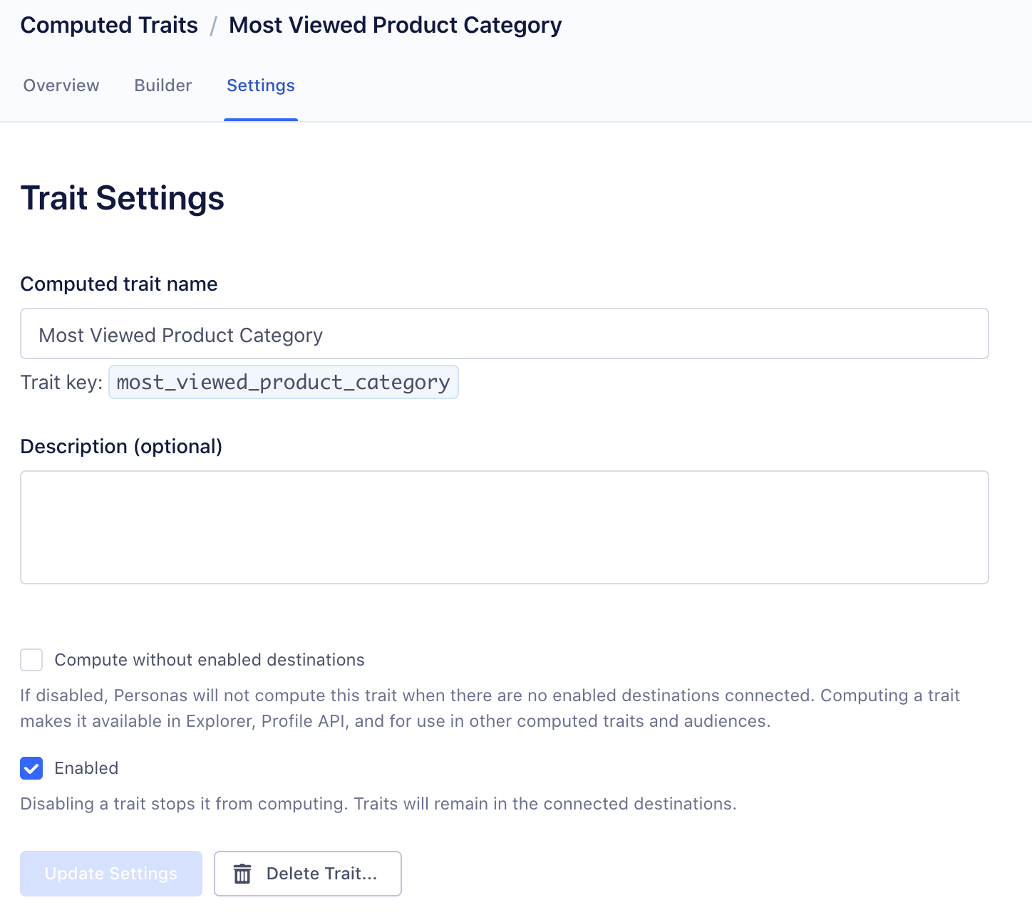 Learn more about Computed trait generated events here. The trait name corresponds to the snake cased name that you see in the trait settings, for example most_viewed_page_category. See the list of Personas-compatible destinations