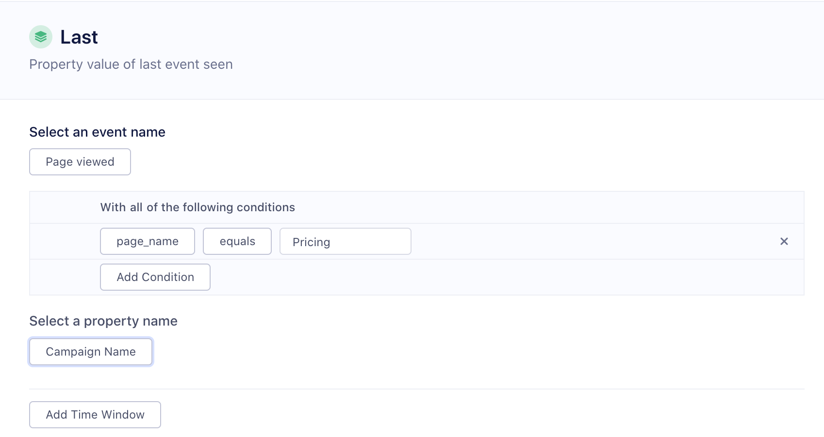 All computed trait types support a common “Add Conditions” section. Conditions defined here restrict the messages considered when calculating the final value of the computed trait by looking at a property of the events. For example, you could limits events to only those where “price” is greater than 30.00 or where “page.url” contains “pricing”.