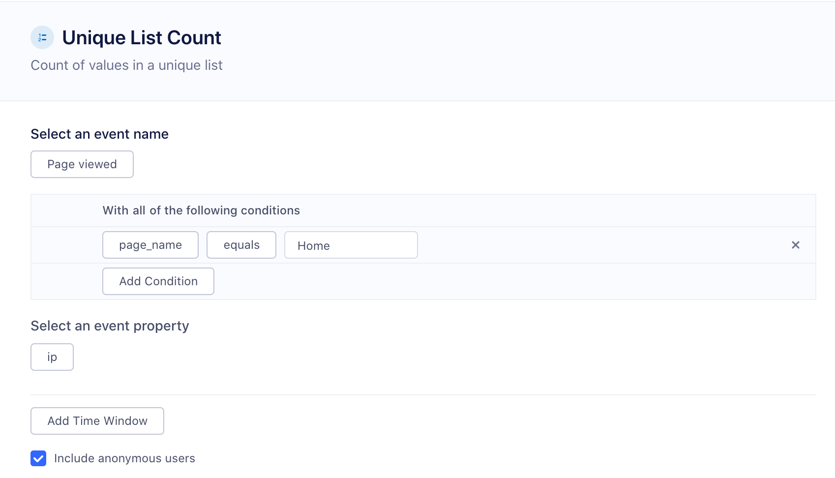 Unique list count computed traits will output a count of the unique list of values for an event property. Customers are creating traits like unique_product_categories_viewed_count to understand the variety of products that a customer is viewing. At the account-level, customers are creating traits like unique_visitors_count to calculate the number of unique visitors by ip address.
