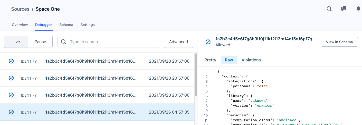 Using the Personas Source Debugger, you can inspect and monitor the events that Personas sends downstream.