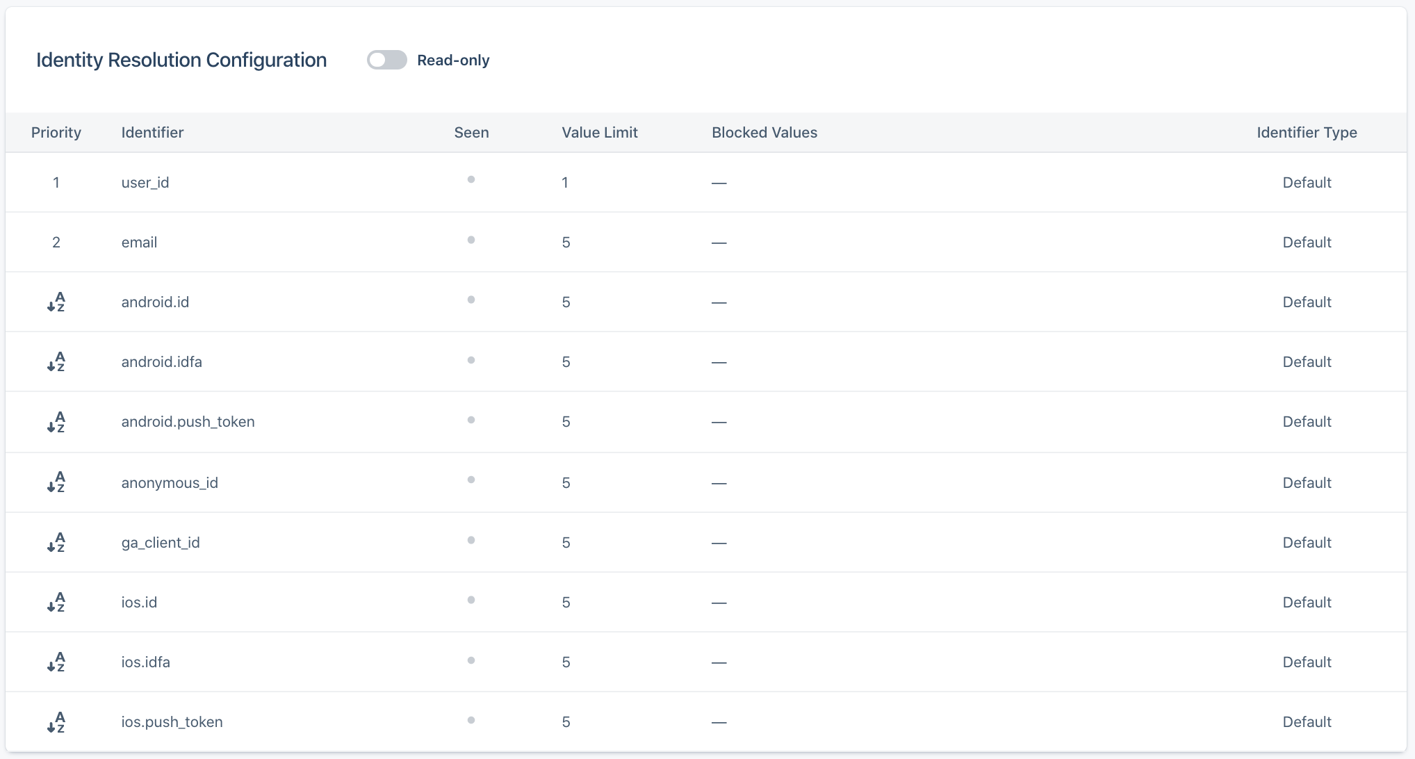 If you require an explicit order for all identifiers, configure this in the Identity Resolution settings page before sending in events.